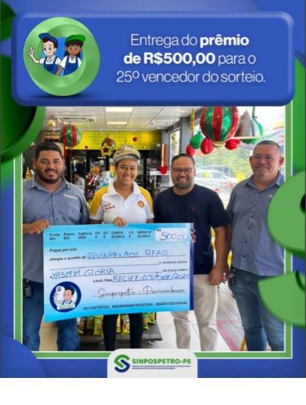 Chegamos na 25º edição do nosso sorteio de R$500,00 do SINPOSPETRO-PE, a grande vencedora desta vez foi Yasmim Glória. A nossa equipe foi até o seu posto de trabalho para entregar o seu prêmio e prestigiar nossos associados.