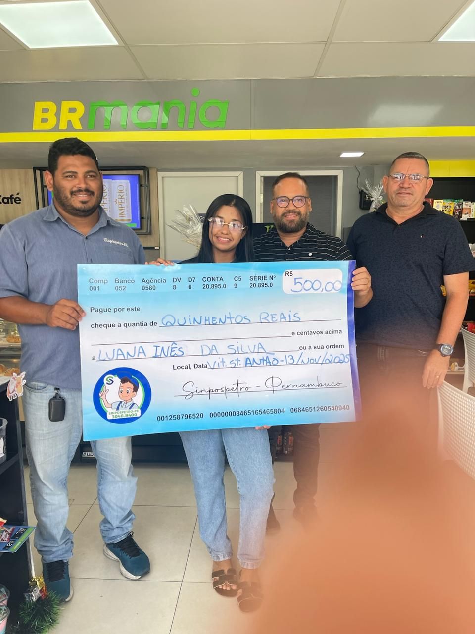 🎉 Entregamos o prêmio de R$500,00 para Luana Inês da Silva, a 22ª vencedora do nosso sorteio semanal. Ela trabalha em um posto localizado em Vitória de Santo Antão e recebeu o valor nesta última segunda-feira (18). A cada semana, mais trabalhadores têm a chance de levar um valor extra para casa. O seu sindicato segue fortalecendo essa iniciativa para reconhecer quem está sempre com a gente. Fica ligado: tem mais sorteio chegando nos próximos dias. Boa sorte! 🍀
