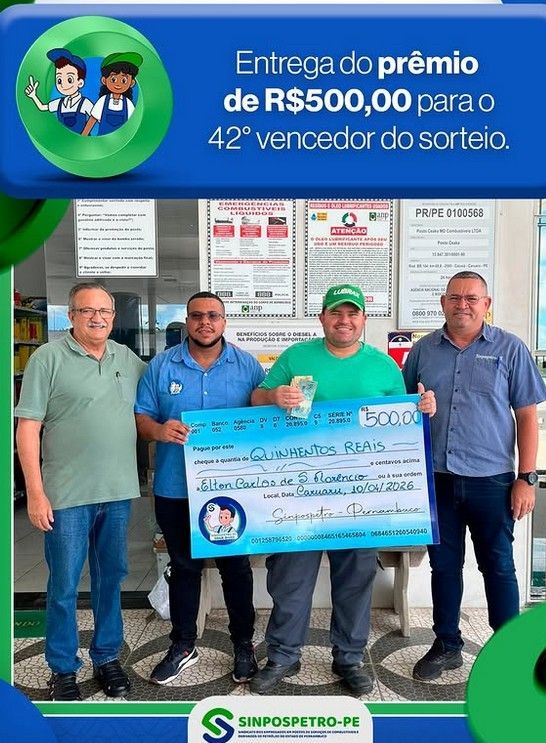 Elton Carlos Florêncio da Silva foi o vencedor do 42º sorteio de R$500,00 do SINPOSPETRO-PE! Aqui, a categoria encontra apoio, benefícios exclusivos. Se você ainda não é associado, essa é a hora de garantir sua filiação e fortalecer sua voz na luta pelos seus direitos e melhores condições de trabalho.